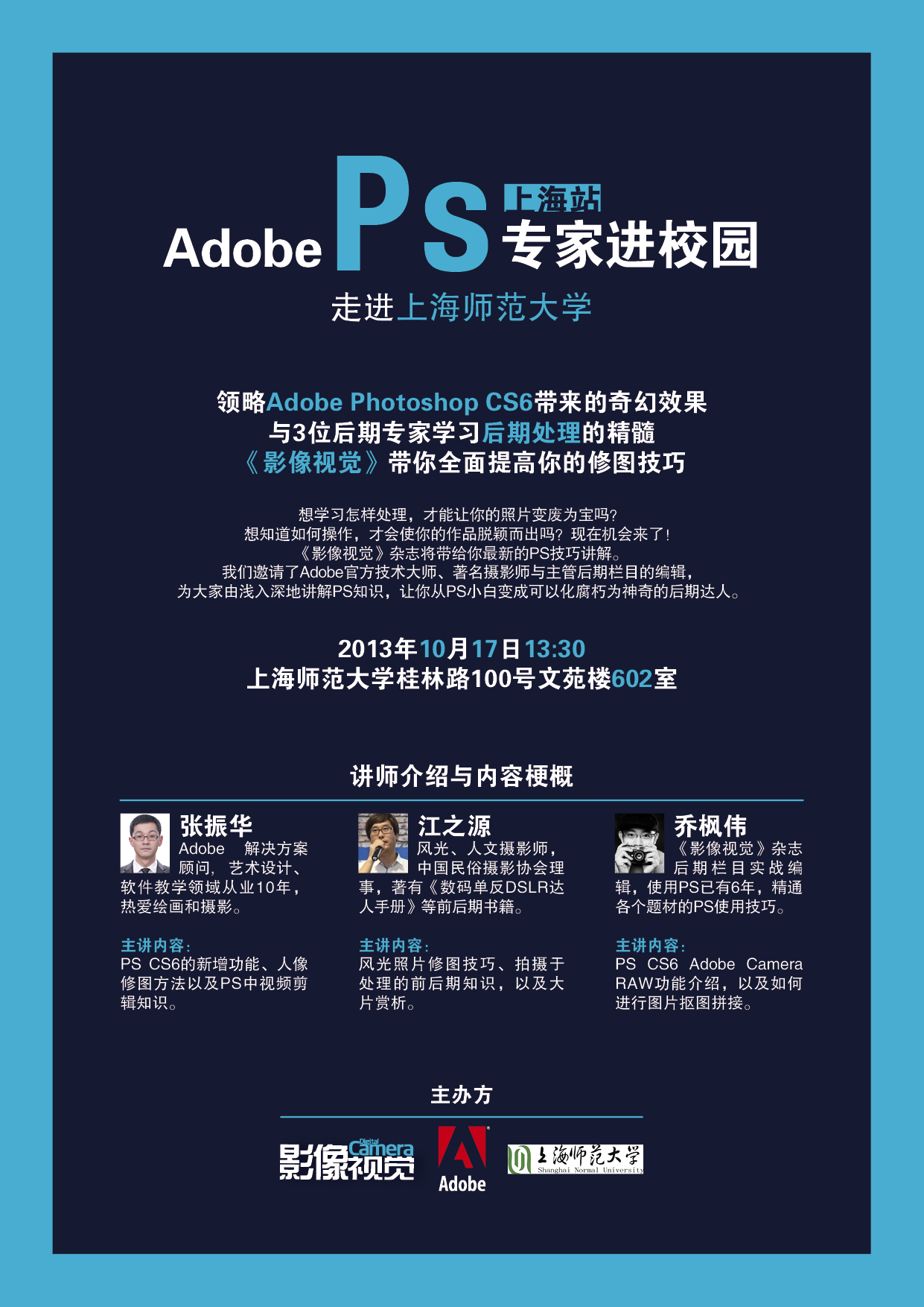 10月17日(周四)下午,《影像视觉》杂志将邀请Adobe Photoshop CS6的专家走进校园。届时,会有3位PS方面的高手为大家讲解Photoshop CS6的功能和操作。无论是学习本专业的学生还是摄影、设计爱好者,都欢迎来听讲座!