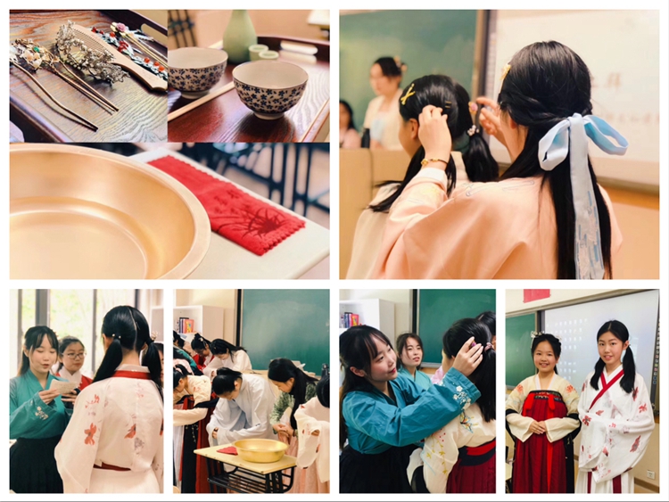 汉服社的社员们通过对身着的汉服进行实例讲授,结合提问和互动等形式,让世外中学的学生们更深切且直接地了解到汉服的起源与发展历程,对于不同时期的服饰特点也有进一步的体会,丰富了历史知识。课程以礼仪教育之线穿起汉服演变历史之珠,从古代文化精髓“忠、孝、诚、信、礼、义、廉、耻”讲授汉服中的礼仪道德要求,上衣下裳效法天地与阴阳,圆袖交领寓意天圆地方,中缝垂带蕴含着人道正直的品德追求。汉服社的社员通过讲解汉服历史与类型进一步向世外中学的学生们传达出中华传统文化的内涵与精神,在授课中弘扬中华文化,增强学生们对文化的认同感。世外中学的学生们也穿上了汉服,体验了一次完整庄重的及笄之礼,让学生们十五岁来临之际了解到古代同龄女子的成年礼仪习俗。通过及笄礼的体验一方面增加对传统习俗礼仪文化的了解,另一方面也是对中学生进行成人意识以及责任意识的培养。
