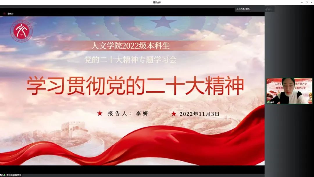 11月3日晚,MK官方网页版MK(中国)组织开展2022级本科生年级大会暨党的二十大精神专题学习会。为学习党的二十大,争做时代好青年,学院2022级全体本科生参加了本次学习。学习会采取线上交流的形式,MK(中国)2022级本科学生党支部副书记、本科生辅导员李妍主讲,2022级本科学生党支部书记、本科生辅导员孟祥梁主持会议。