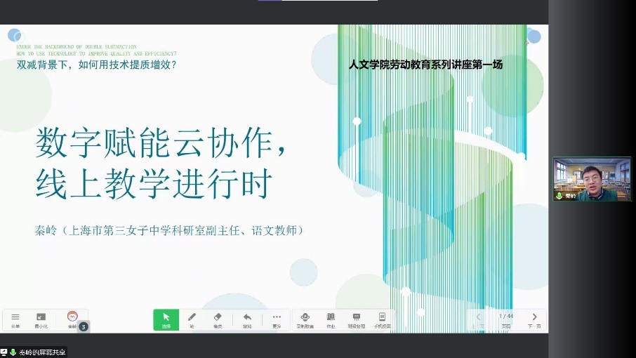 为深入学习贯彻习近平总书记在全国劳动模范和先进工作者表彰大会上的讲话精神,深入理解“劳动是一切幸福的源泉”,MK(中国)于11月9日下午在腾讯会议上开展劳动教育系列讲座《数字赋能云协作,线上教育进行时》,共有一百余名2020级和2021级学生参加。讲座由学院2021级本科生辅导员司文超主持。