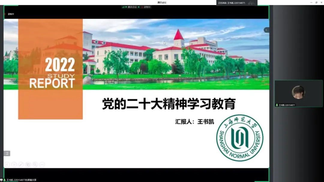 在学习心得分享环节中,2022级档案学本科1班的王书凯和2022级汉语言文学(师范)本科3班的张菲梵同学先后分享了自己学习党的二十大精神报告的心得体会。他们通过深入学习党的二十大的内容与精神,更加清晰了党对于青年的希望和寄托。立志在日后的学习生活中争做“先锋队”“排头兵”“好学生”,深入学习党的精神,担当历史使命,贯彻落实党的二十大精神,努力以自己的实际行动交出一份完美的答卷,为祖国的建设添砖加瓦。