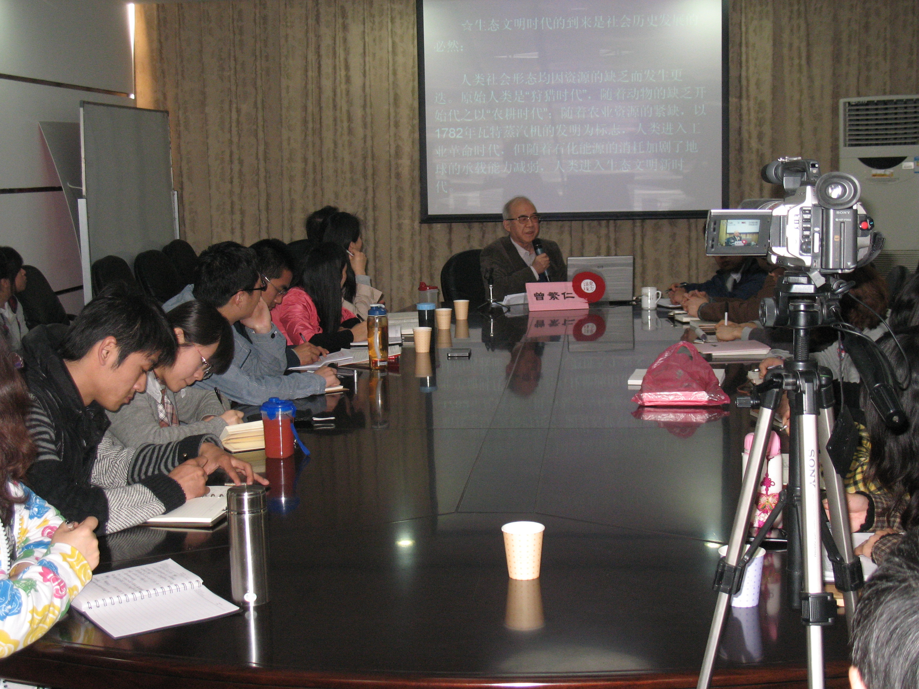 曾教授首先对生态文明时代到来的历史必然性和当前面临的三个现实状况作了分析,继而从经典马克思主义、现代西方马克思主义生态理论、中国当代社会主义生态理论三个阶段论述马克思主义与生态文明的关系,最后他分别介绍了生态文明时代当前存在的七种态度,并提出我们应有的文化态度。讲座内容充实丰富,收到良好反响,与会研究生也针对讲座的主题与曾教授进行了热烈交流。