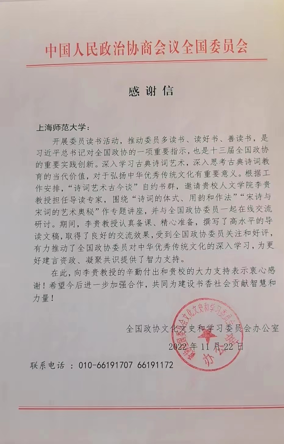 近日,全国政协文化文史和学习委员会给我校发来感谢信,感谢我院中文系李贵教授在政协委员读书活动中的辛勤付出。