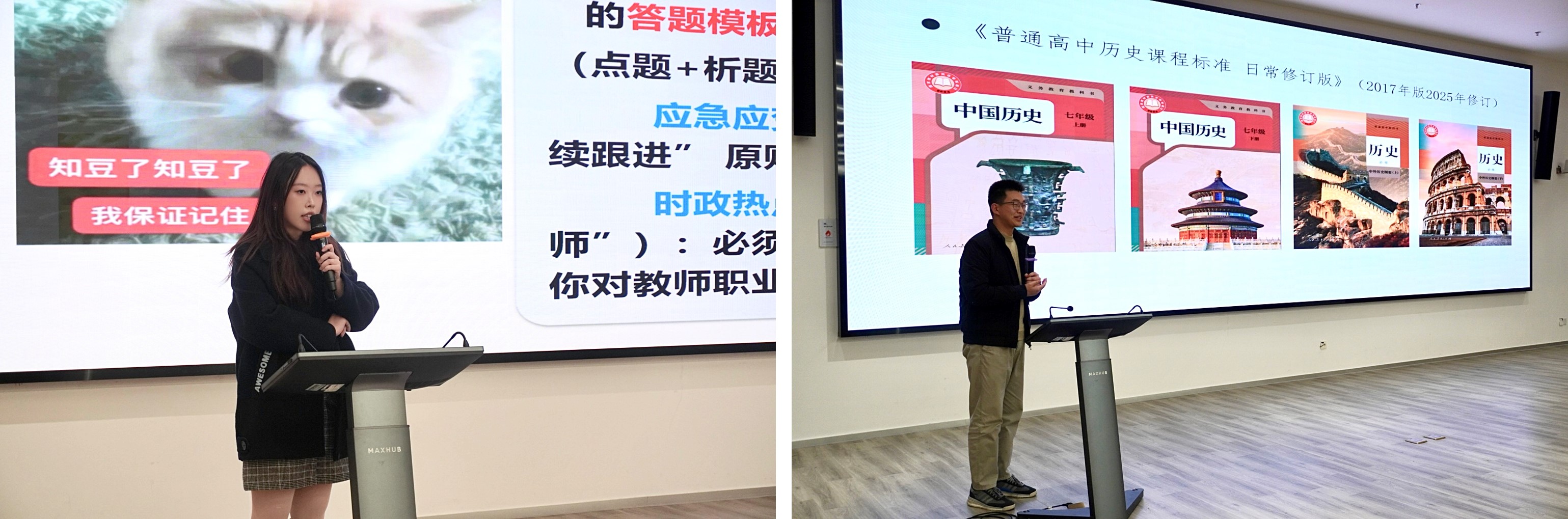 校研究生支教团成员、2022级汉语言文学(师范世承)专业余乐怡以“上岸吧,准教师”为主题,系统解析教资面试全流程。她从考前准备切入,拆解结构化面试、试讲与答辩的答题要点和复习策略,通过模拟面试全流程,细致讲解候考、备课等环节核心要点,分析评分标准与面试表现的关联,给出实用的备考指导。第十届“田家炳杯”全国师范院校师范生教学技能竞赛一等奖获得者、2022级历史学(师范)专业的张宇晨结合比赛经验,以高中历史课为例阐释唯物史观、时空观念等核心素养在备课中的具体体现,提醒同学们要熟练掌握课标与教材,注重以问题驱动课堂设计,要以赛促学、以赛促练,积极主动参与相关赛事的报名。