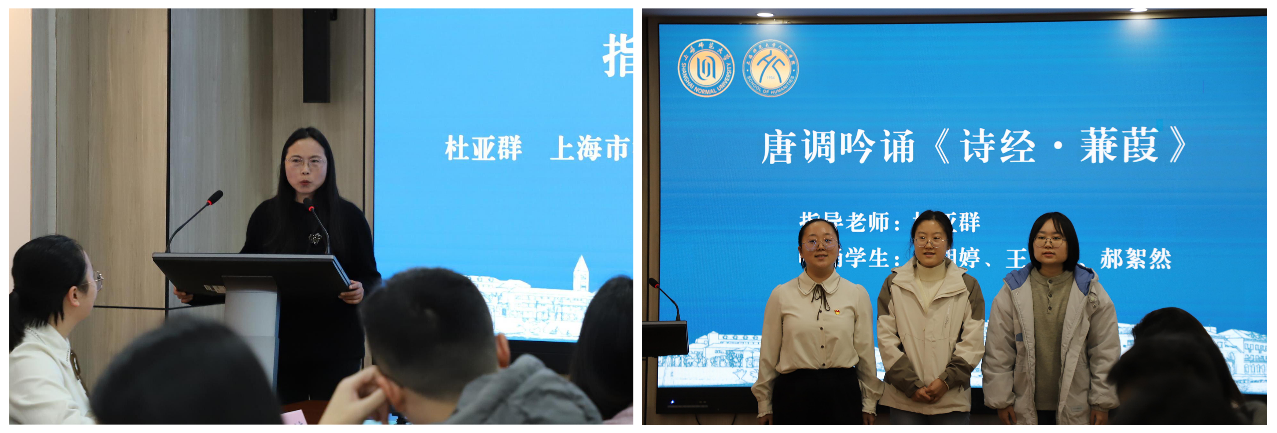 作为活动指导老师,杜亚群在发言中分享了唐调的历史渊源与文化价值,并表示“今天正值著名教育家、国学大师唐文治先生诞辰160周年纪念日”,在先生诞辰当日开班,有着深远的意义。第一批传承与推广团队骨干成员朱湘婷、王文玲、郝絮然展示唐调吟诵学习成果《诗经·蒹葭》,将在场师生带入非遗艺术的雅致氛围中。