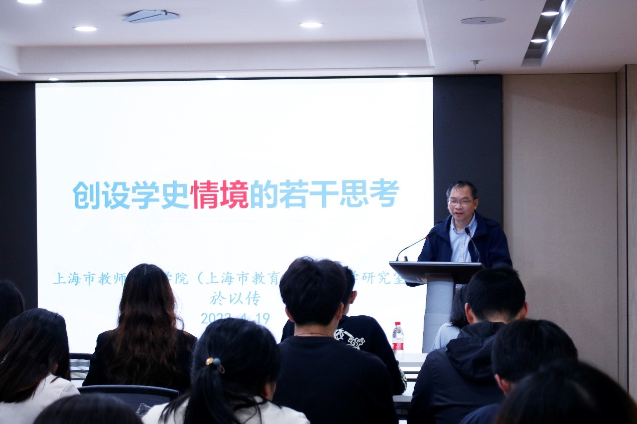 随后,与会师生共同聆听了於以传、朱志浩两位专家的学科教学讲座。於以传为大家带来的讲座是《创设学史情境的若干思考》。首先,於老师指出,“情境教学”不是新说法,1988年上海启动第一轮课程改革时,中学历史学界专家便提出了“情境教学”的概念。经过了二十余年的发展,当前的课程标准中如何说“情境”呢?於老师对普通高中历史课程标准(2017年版2020年修订)中关于历史情境的内容进行了文本解读。创设历史情境有两层作用,一是再现历史发展的过程,二是呈现历史认识的过程。学业水平考试命题时也强调生活情境和社会情境,使学生感受社会生活中的历史。於老师认为,历史基础教育的终极目标不是培养历史学家,而是助力学生通过历史视角,运用所学的历史知识、方法和能力审视生活。义务教育历史课程标准(2022年版)中也同样提到,要从日常生活情境中探寻历史问题。接下来,於以传老师就历史教学和评价中如何创设历史情境提出了若干思考,并从社会热点和生活经历两个角度举例,手把手教授大家如何从社会生活中创设情境,再现与认识历史。