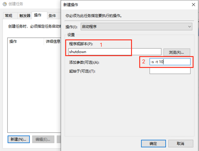 5、在“操作选项卡”里,点击底部的“新建”,在“程序启动脚本”中填入“shutdown”(关机命令),参数填“-s -t 10”(关机前会有个提示:10秒倒计时,如果不想关机可以手动取消)。最后保存确定即可完成此项计划。