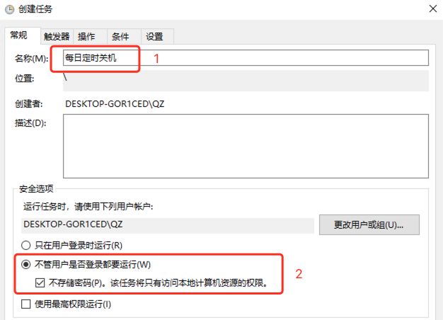 3、在“常规选项卡”里,给本次计划取个名字,比如“每日定时关机”。为了实现不登录进系统的时候依旧有效,请选择“不管用户是否登录都要运行”,并在“不存储密码”之前的框里打勾。