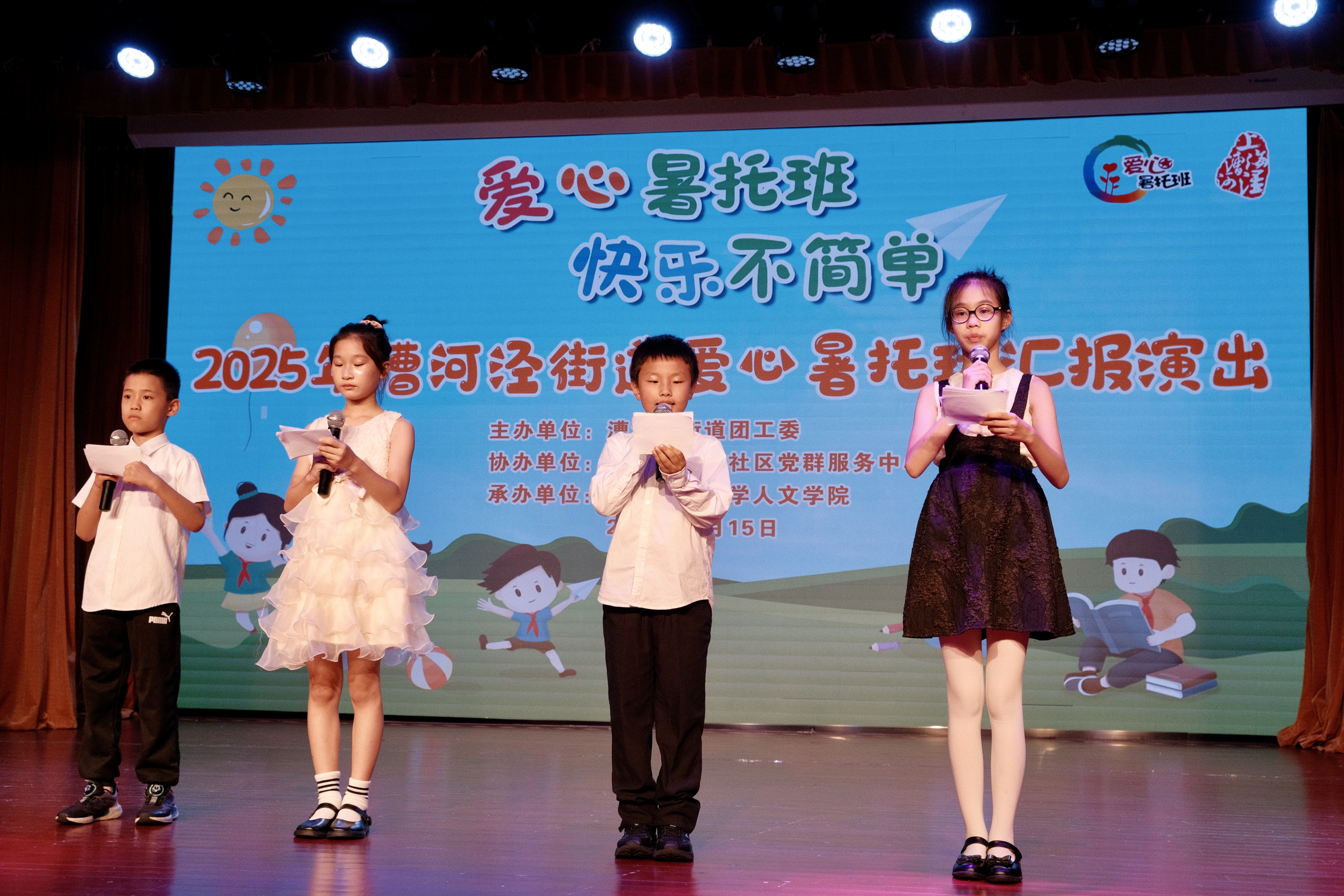 8月15日晚,2025年漕河泾街道爱心暑托班汇报演出在漕河泾街道社区党群服务中心一楼剧场举行。漕河泾街道、MK官方网页版MK(中国)相关负责人,街道暑托班师生及家长共计200余人参与活动。