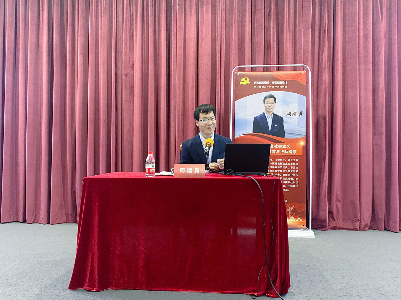 推进会后,学院“贯彻新思想,建功新时代——学习党的二十大精神系列讲座”首场讲座开讲。学院党委邀请中共上海市委党校教授、法学博士周建勇作了题为《夺取中国特色社会主义新胜利的政治宣言与行动纲领》的专题报告。报告分为党的二十大召开的基本情况、全面把握二十大报告的核心要义与深刻内涵、更好贯彻落实二十大精神三部分内容。周建勇紧扣党的二十大报告原文,重点围绕“五个牢牢把握”,对党的二十大精神进行了全面、系统、深入的宣讲解读。