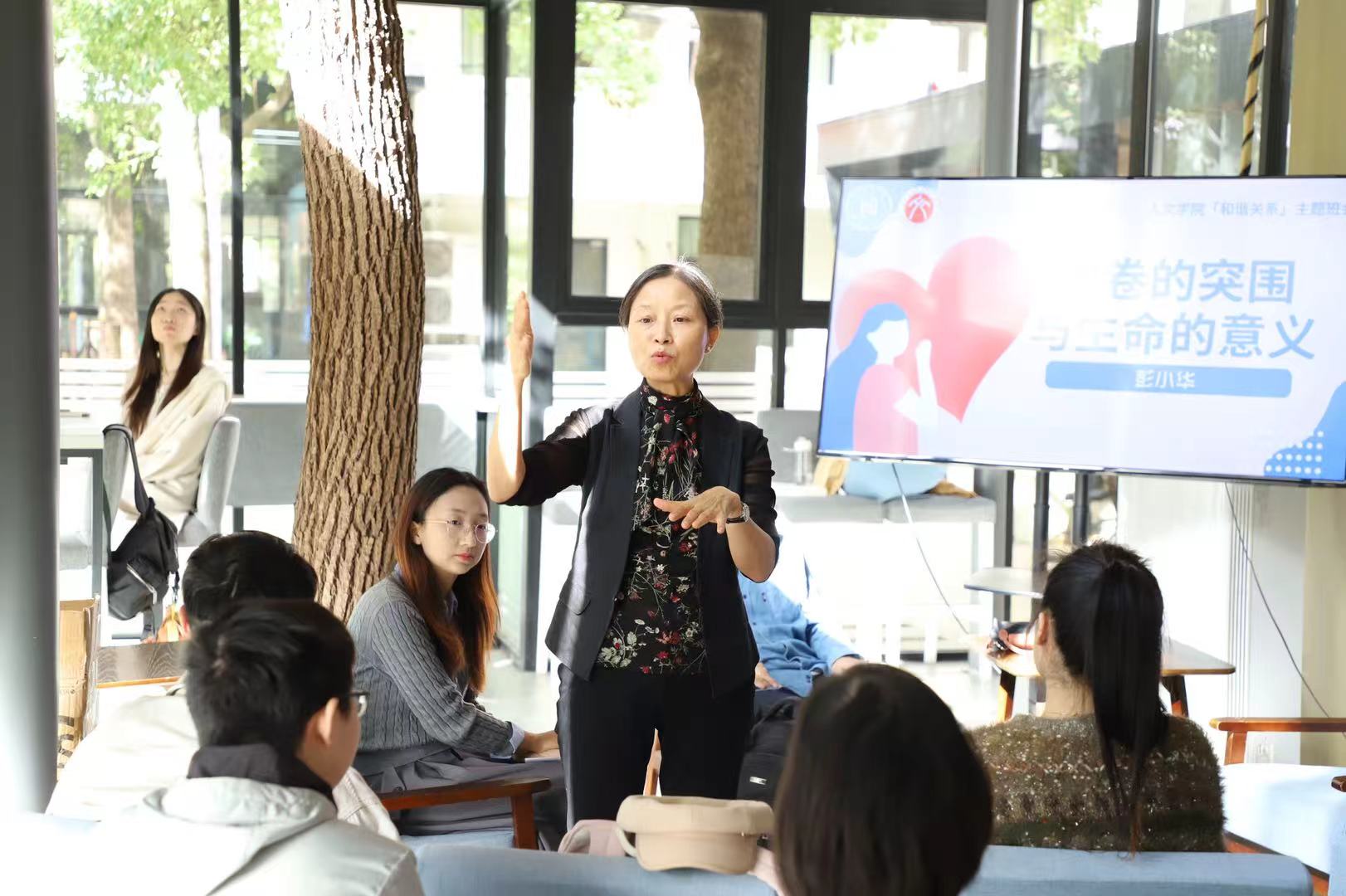 最后,彭老师针对如何追求个体的理想状态这一命题,提出了一个维持个体快乐与幸福的模型,分析了模型中常见的“躺平式”与“内卷式”两种生活模式。她鼓励同学们,思考“什么对我而言是真正重要的”,从而在纷繁复杂的“内卷”洪流中,找到属于自己的航向,实现真正意义上的“突围”。同学们深受启发,并与彭老师交流自己对“内卷”与“躺平”的思考。