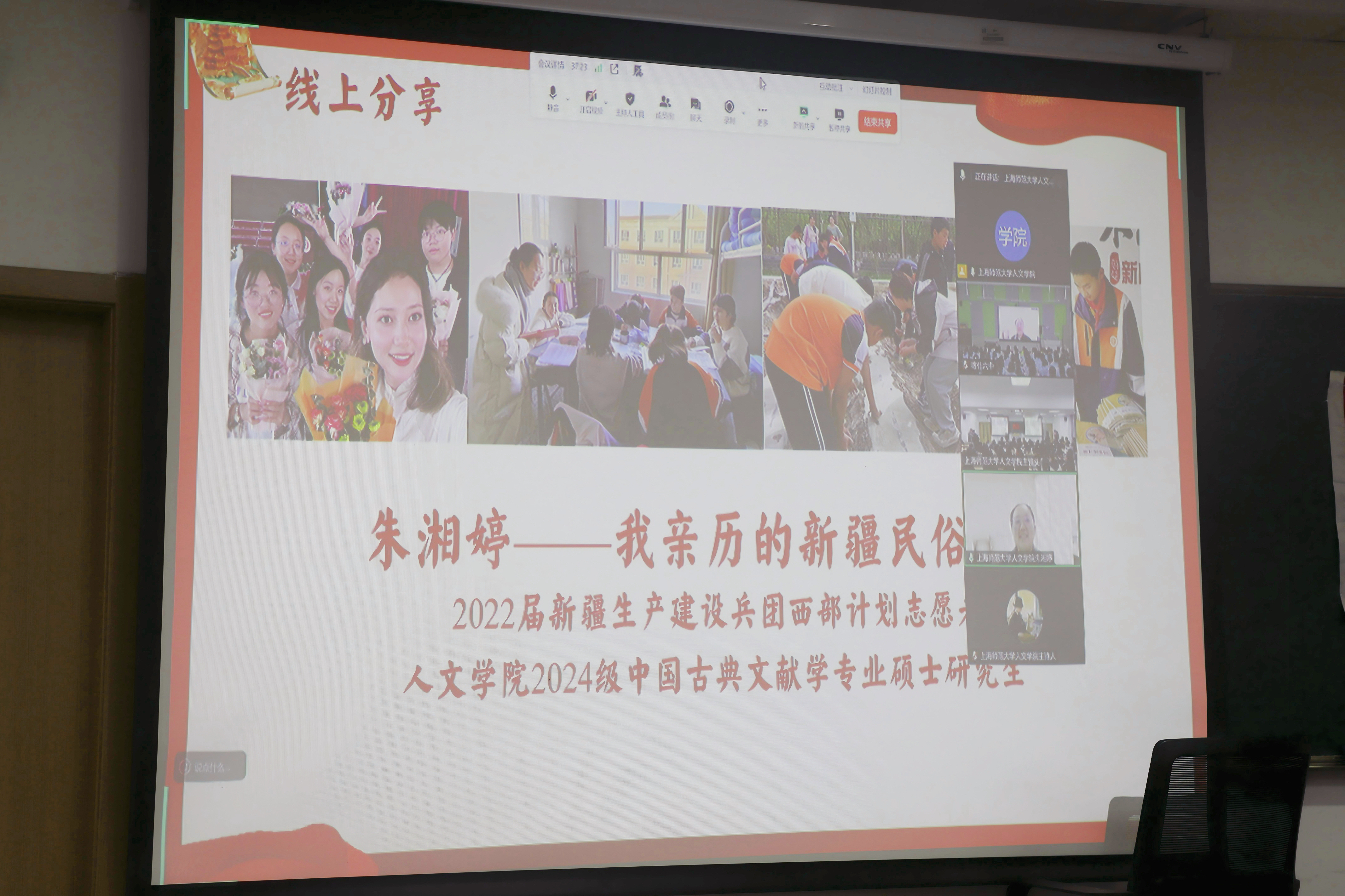 本次活动特别邀请MK(中国)2024级中国古典文献学专业硕士研究生、2022届新疆生产建设兵团西部计划志愿者朱湘婷为同学们分享她亲历的新疆生活,朱湘婷的生动讲述让同学们真切体会到新疆民俗文化里的温度与韵味。随后,朱佳萱、叶子萱以“家访中的故事”为载体,带领两地的同学们走进对方城市的特色建筑与民俗文化,感受上海的石库门与江南茶礼,以及新疆传统民居的穹顶与艾德莱丝绸围巾,帮助两地青年读懂各民族生存智慧与审美追求的“立体史书”。