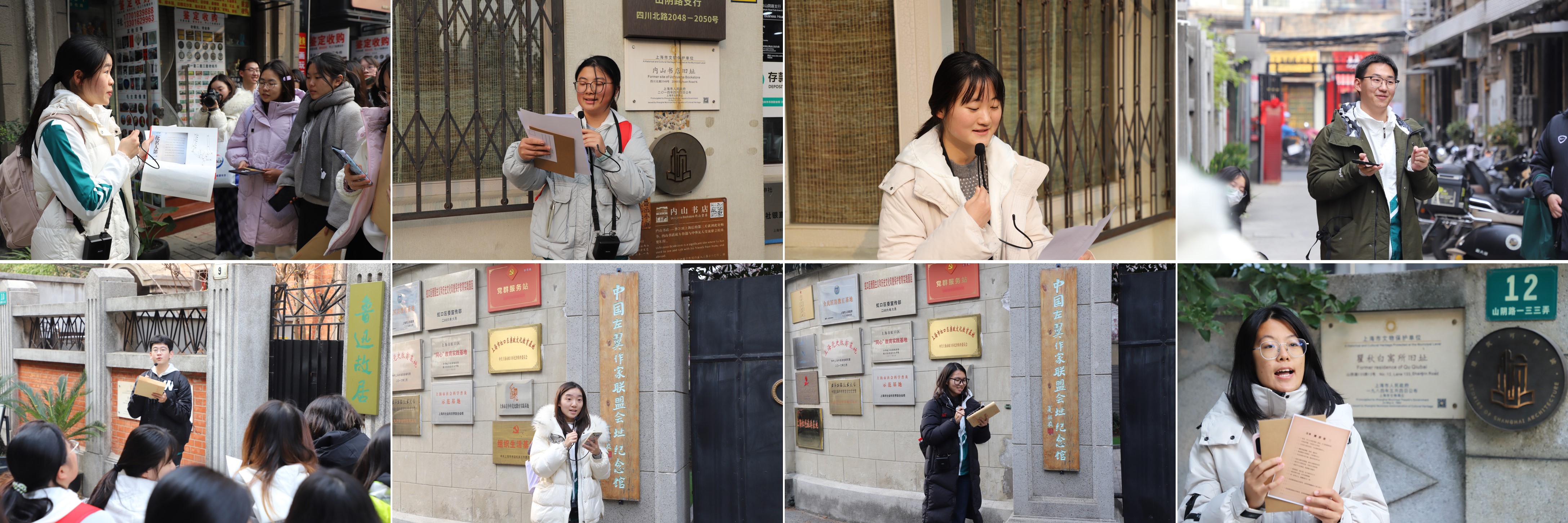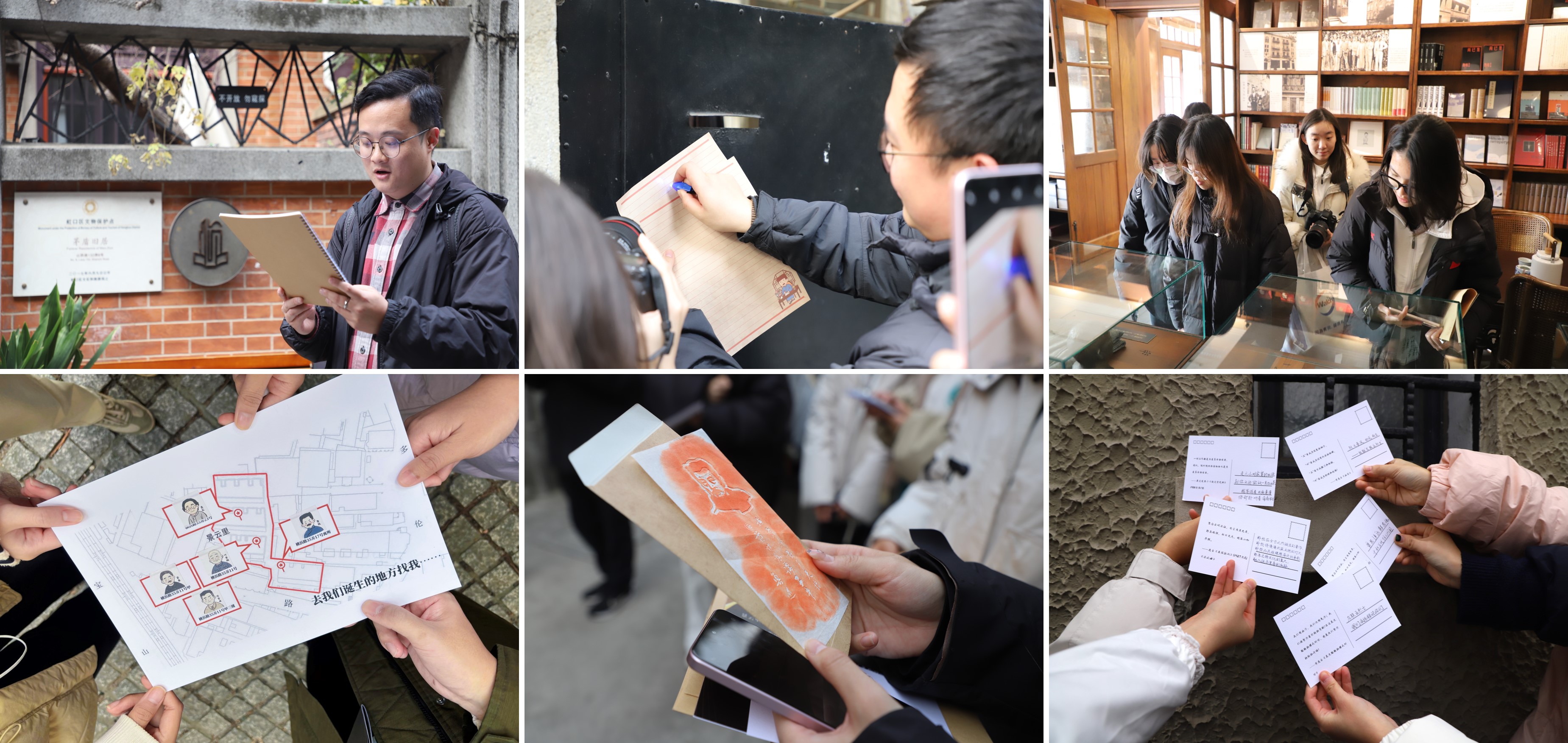 在起点景云里,同学们借助“邻居地图”在街巷中寻访鲁迅、冯雪峰、叶圣陶等文化名人的生活印记,在真实的街巷空间中感受历史。在中国左翼作家联盟成立大会旧址,大家通过给“左联五烈士”书写缅怀明信片的方式表达对革命先烈的崇高敬意。内山书店旧址的“密信显影”环节,则利用道具“显影笔”巧妙再现了历史斗争的智慧。在鲁迅故居、茅盾旧居,同学们通过感受木刻版画艺术、导师带读《写给苦闷青年的一封信》,体悟以笔为刃、剖析时代的深邃与坚韧,展开了一场跨越时空的青年对话。在瞿秋白寓所旧址,对着其翻译的首版中文《国际歌》,全体同学以激昂的颂唱共同完成了这场“寻火之旅”的精神升华。