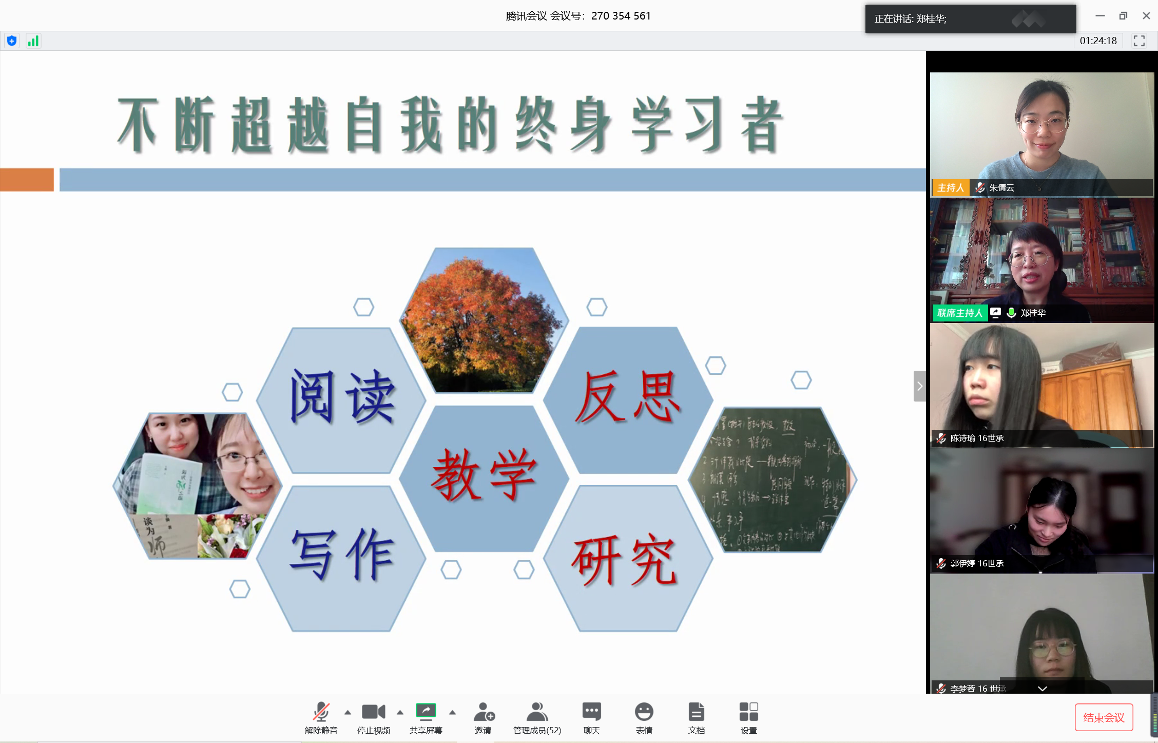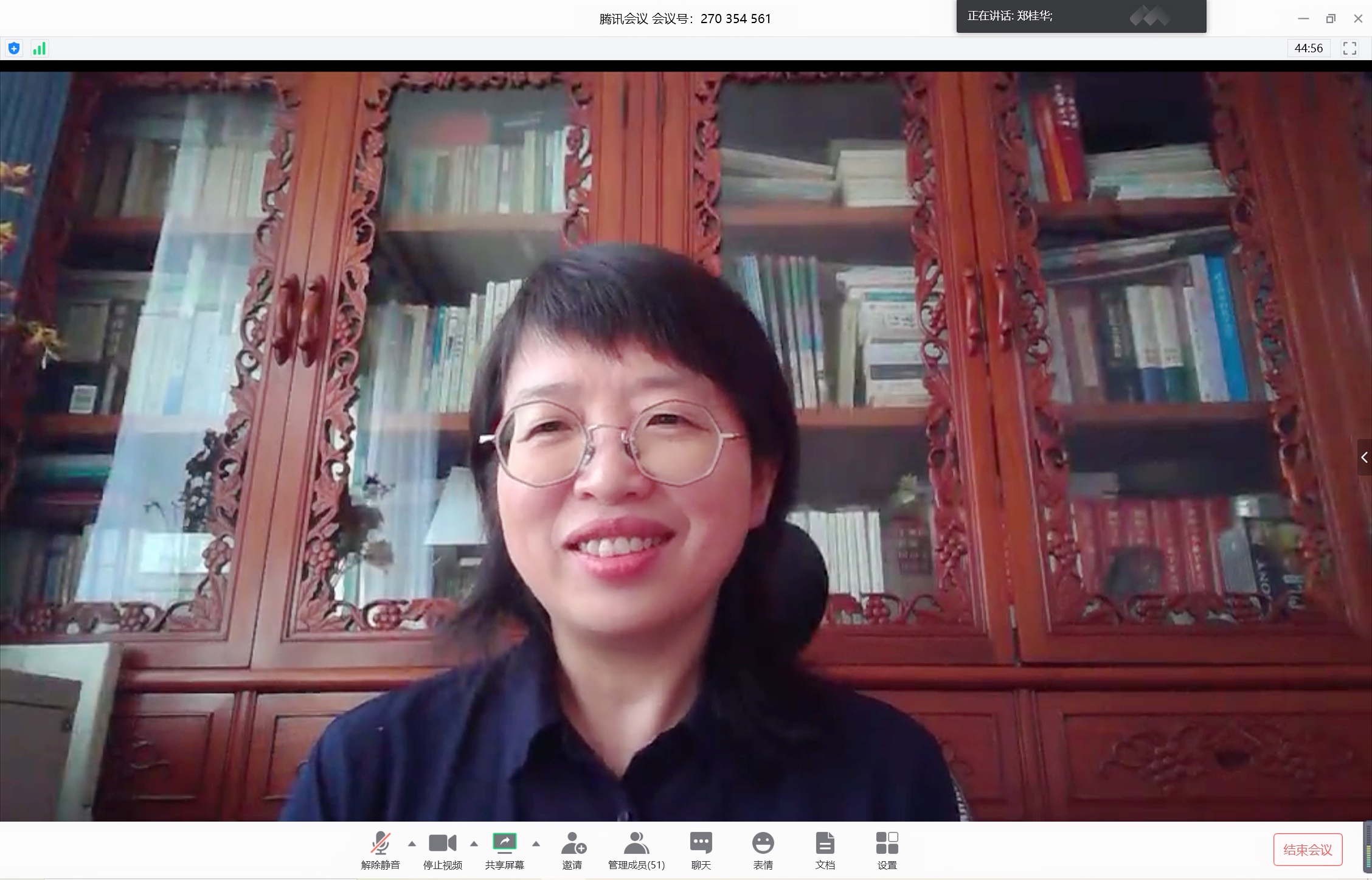 沙龙最后,同学们就郑桂华教授谈到的内容视频连线互动。郑桂华教授对大家提出的问题给予详尽耐心的指导与鼓励,再次强调“眼中有学生,心中有未来”这一不变的教学宗旨,并真诚分享自己的人生态度:人的一生会遇到天灾人祸,也不免因为这些磨难产生彷徨。一方面,我们要学会接纳自己,懂得与自己和解,从而不陷入低沉;另一方面,我们要勇于自我追问、自我突破,走到那颗流光溢彩的树的背面去看一看,从重复消磨的生命状态中遁出。