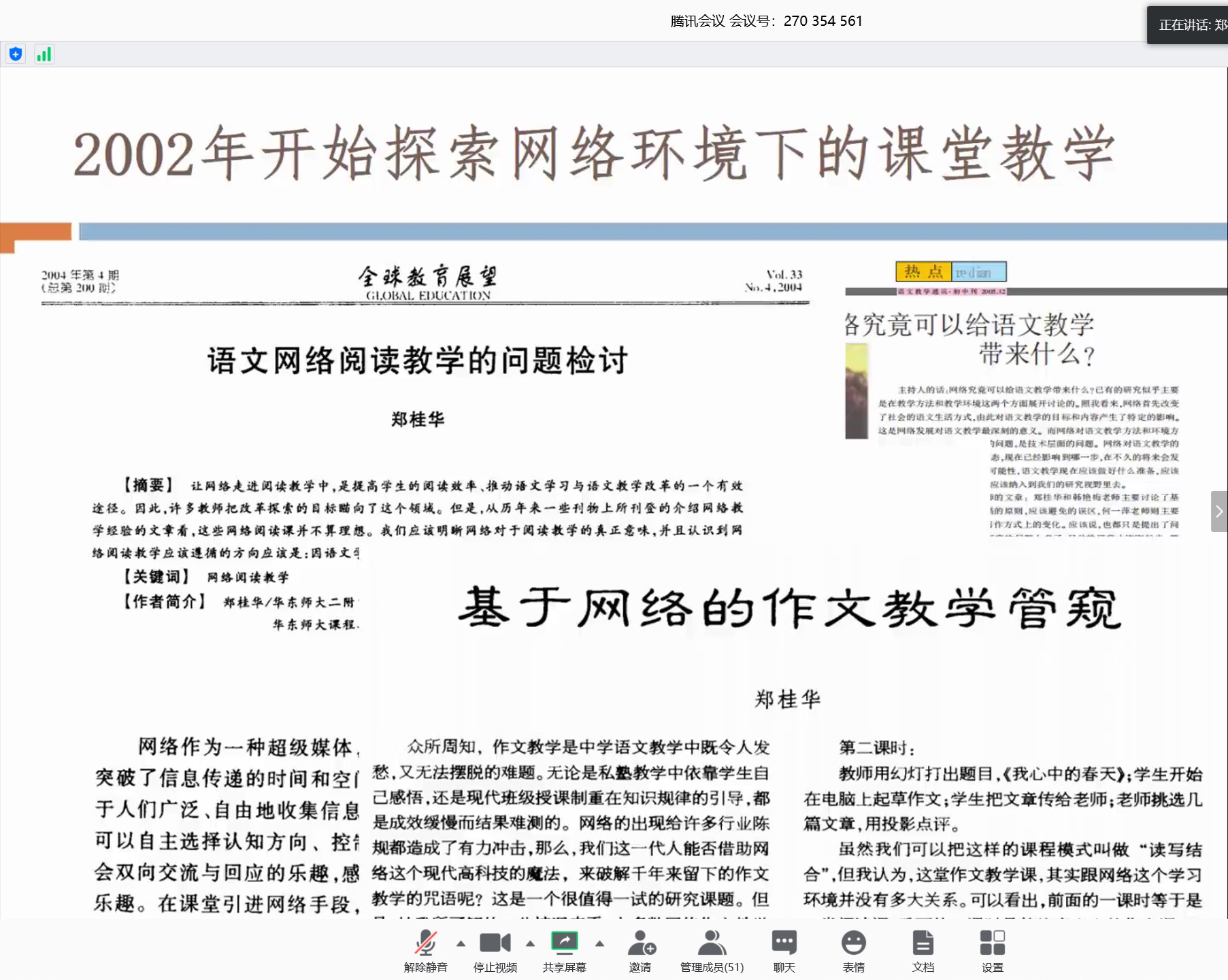 “成为一名不断超越自我的终身学习者”是需要躬身力行的。疫情当下的线上教学开展便是一次考验,它为教育行业带来诸多挑战,同时也给予教育工作者新的思考。在人工智能、5G技术逐渐普及的时代发展趋势下,线上教育正是对教师新媒体运用能力的检视与锻炼。郑桂华教授展示了自2002年以来网络环境下课堂教学探索的相关研究,探讨新时代教师应如何提升信息化素养,站在新媒体教学的新起点应对线上教学新难题,实现传统课堂的现代化智能转型。