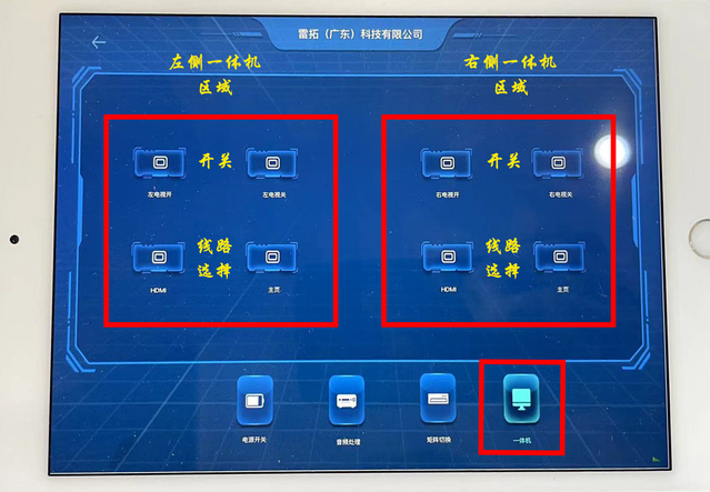 5、“一体机”选项卡用来控制左右两台Maxhub一体机,包括远程开启、关闭以及切换显示的内容。每个一体机内嵌的Windows系统都可以独立使用,但上述的“矩阵切换”方式都是基于HDMI线路实现的,所以一般都切在HDMI这一路。